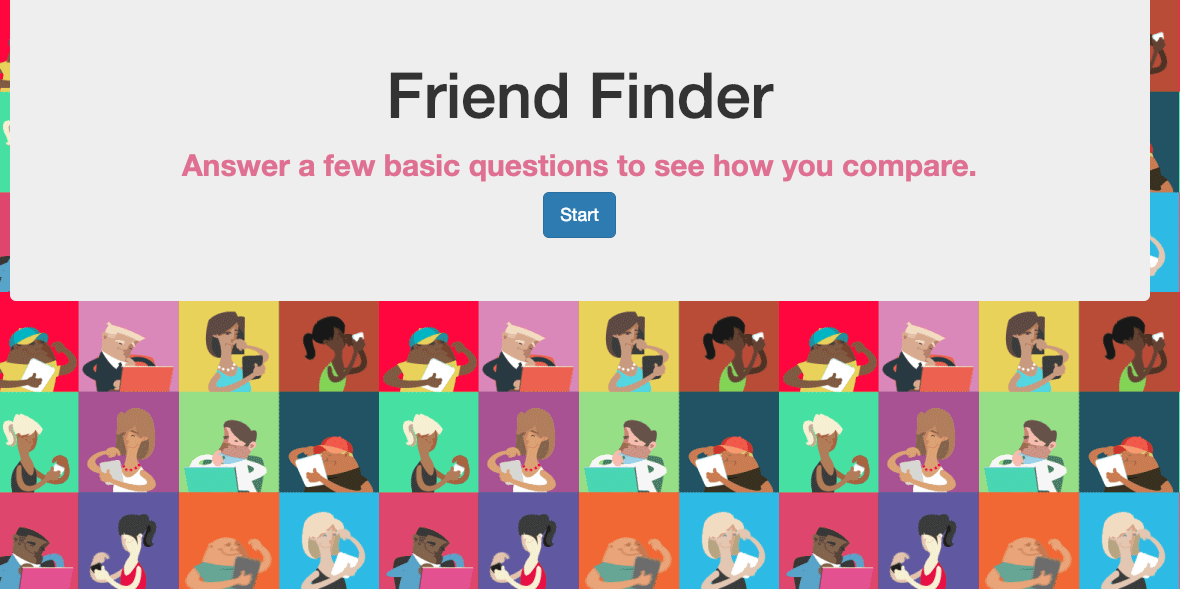 This full-stack site will take in results from your users' surveys, then compare their answers with those from other users. The app will then display the name and picture of the user with the best overall match.